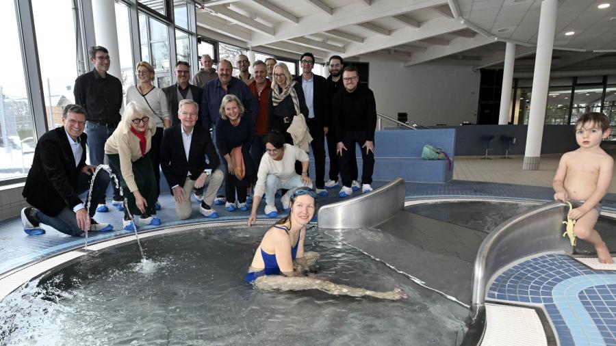 Mit einer Feierstunde ist am Freitagnachmittag ein weiterer Meilenstein der umfassenden Sanierung der Schwimmhalle im Grünwalder Freizeitpark abgeschlossen worden. Zahlreiche Gemeinderäte, Vertreter der beteiligten Baufirmen sowie Projektverantwortliche waren bei der Eröffnung des Kinderplanschbeckens vor Ort.