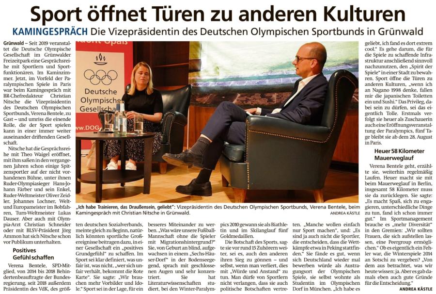 Die viermalige Weltmeisterin und zwölfmalige Paralympics-Siegerin Verena Bentele war zu Gast beim sechsten Kamingespräch im historischen Kaminzimmer im Grünwalder Freizeitpark. Bentele, die seit 2021 auch Vizepräsidentin des Deutschen Olympischen Sportbundes (DOSB) ist, diskutierte mit BR-Chefredakteur Christian Nitsche nicht nur Herausforderungen und Chancen der bevorstehenden Olympischen und Paralympischen Spiele in Frankreich. Diskutiert wurden auch gesellschaftliche Fragestellung, wie wichtig für Deutschland das Gemeinschaftsgefühl bei Sportveranstaltungen angesichts einer polarisierten Gesellschaft ist und ob Sportlerinnen und Sportler sich zu politischen Themen äußern sollten.