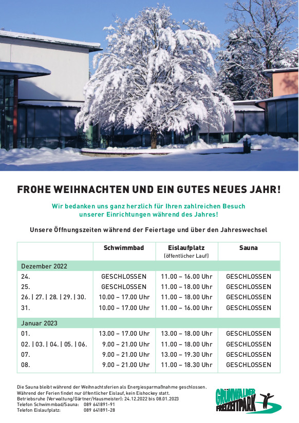 Während der Weihnachtsferien - 24.12.22 bis 08.01.23 - haben wir gesonderte ÖFFNUNGSZEITEN für das Schwimmbad und den Eislaufplatz. Die Sauna bleibt auf Basis eines Beschlusses des Verwaltungsausschusses der Gemeinde Grünwald in den Winterferien geschlossen.
